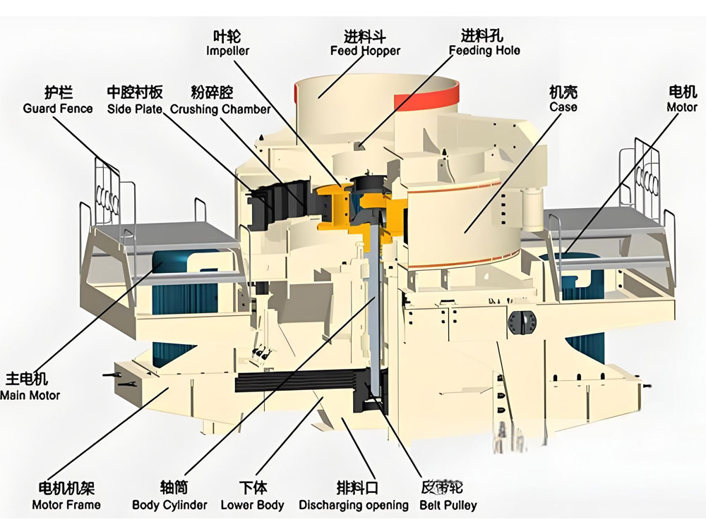 عندما تتلقى كسارة التأثير CV229 VSI أمر التشغيل، يبدأ المصنع بالكامل في الدخول في حالة العمل. أولاً، يتم تشغيل مصدر الطاقة ويبدأ المحرك في العمل ويسرع دورانه تدريجيًا. هذه العملية ليست بداية مباشرة بسيطة، ولكنها تنطوي على نظام نقل معقد. على وجه التحديد، يتم توصيل المحرك بالدوار من خلال حزام مثلث، وعندما يدور المحرك، فإنه سيدفع الدوار للدوران معًا من خلال الحزام المثلث. تستغرق هذه العملية بعض الوقت للوصول إلى حالة تشغيل ثابتة، لذلك عادة ما تكون هناك مرحلة إحماء وتسريع، والتي يمكن أن تكون 10 دقائق أو أكثر، لضمان قدرة الدوار على الوصول إلى سرعة التشغيل المطلوبة.