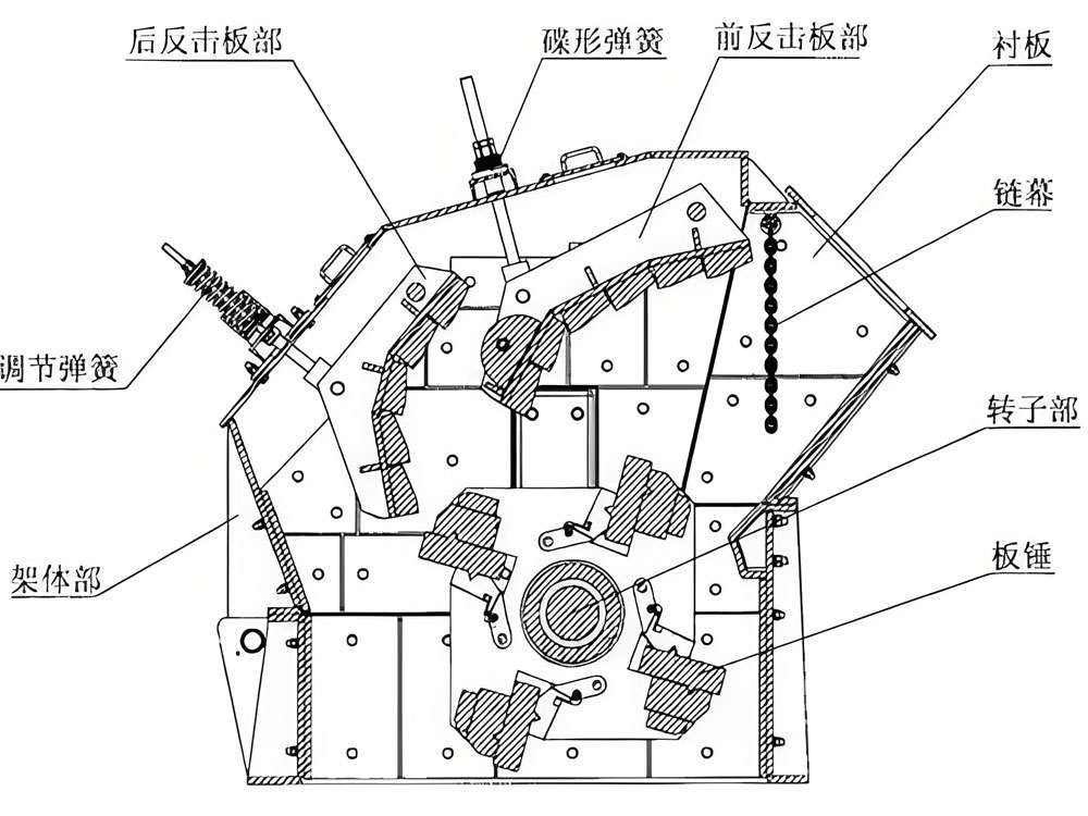 مبدأ عمل الكسارة التأثيرية هو استخدام طاقة التأثير لسحق المواد. أثناء عملية العمل، يدفع المحرك الدوار للدوران بسرعة عالية. بعد دخول المادة إلى منطقة عمل مطرقة اللوحة، تصطدم بمطرقة اللوحة على الدوار ويتم سحقها. يتم رمي المادة المسحوقة على لوحة التأثير، ويتم صدمها وسحقها مرة أخرى، ثم ترتد من لوحة التأثير إلى منطقة عمل مطرقة اللوحة، وتتكرر العملية المذكورة أعلاه. من خلال ضبط الفجوة بين لوحة التأثير ومطرقة اللوحة، يمكن التحكم في حجم حجم الجسيمات الناتجة. لا تتمتع طريقة السحق "ضرب الحجر بالحديد" هذه بنسبة سحق كبيرة فحسب، بل تتميز أيضًا باستهلاك منخفض للطاقة في الوحدة، مما يمكن أن يلبي متطلبات عملية "المزيد من السحق وأقل طحنًا".